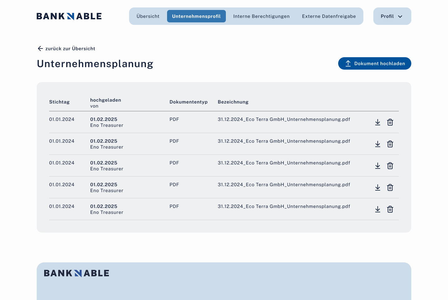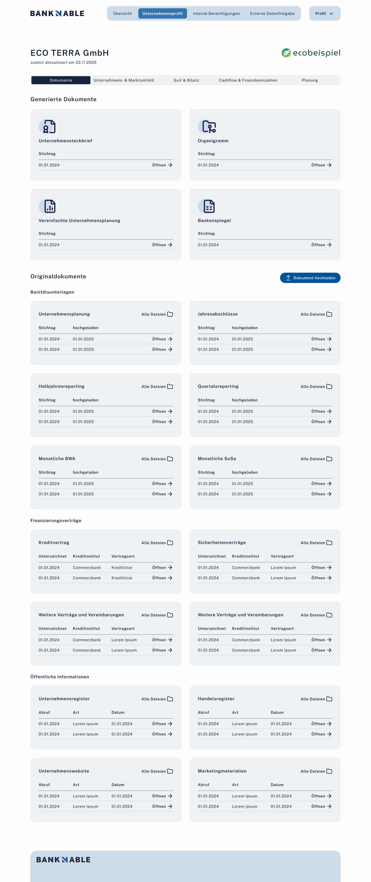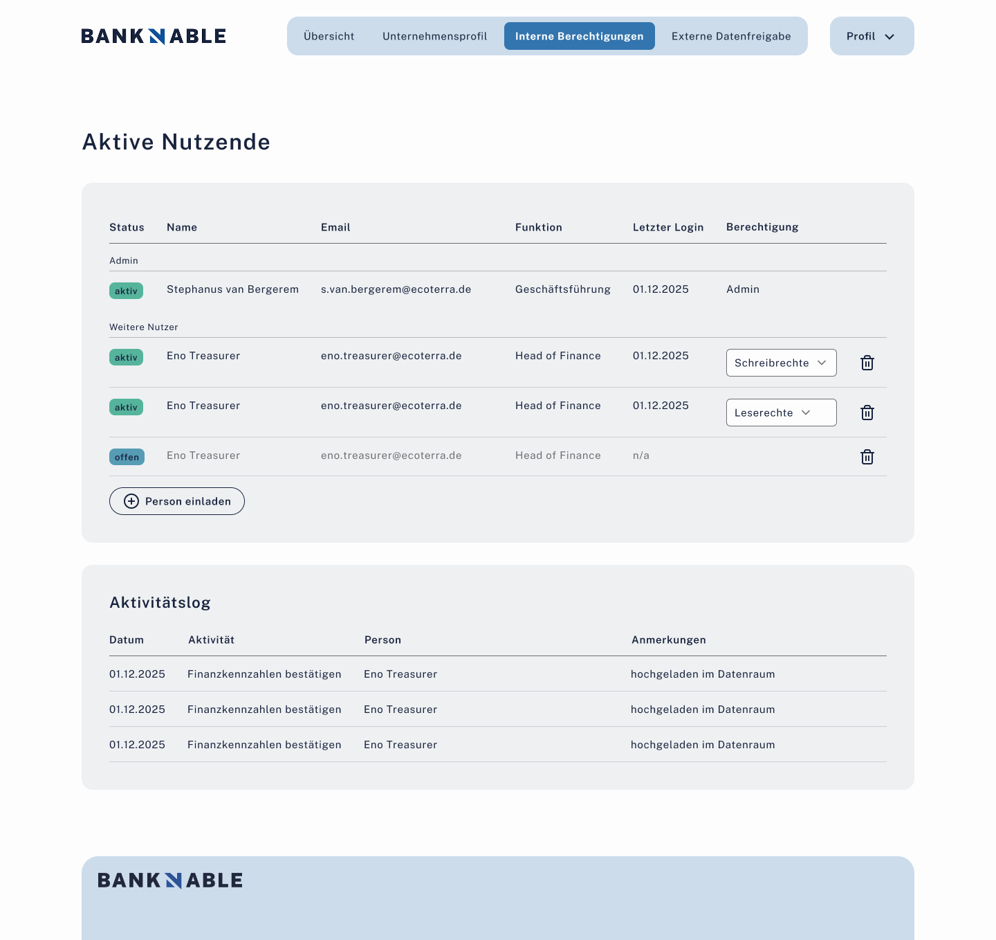 OffenInterne Nutzerverwaltung (Admin, Schreibrechte, Leserechte). Externe Datenfreigabe-Matrix (Dokument × Bank).