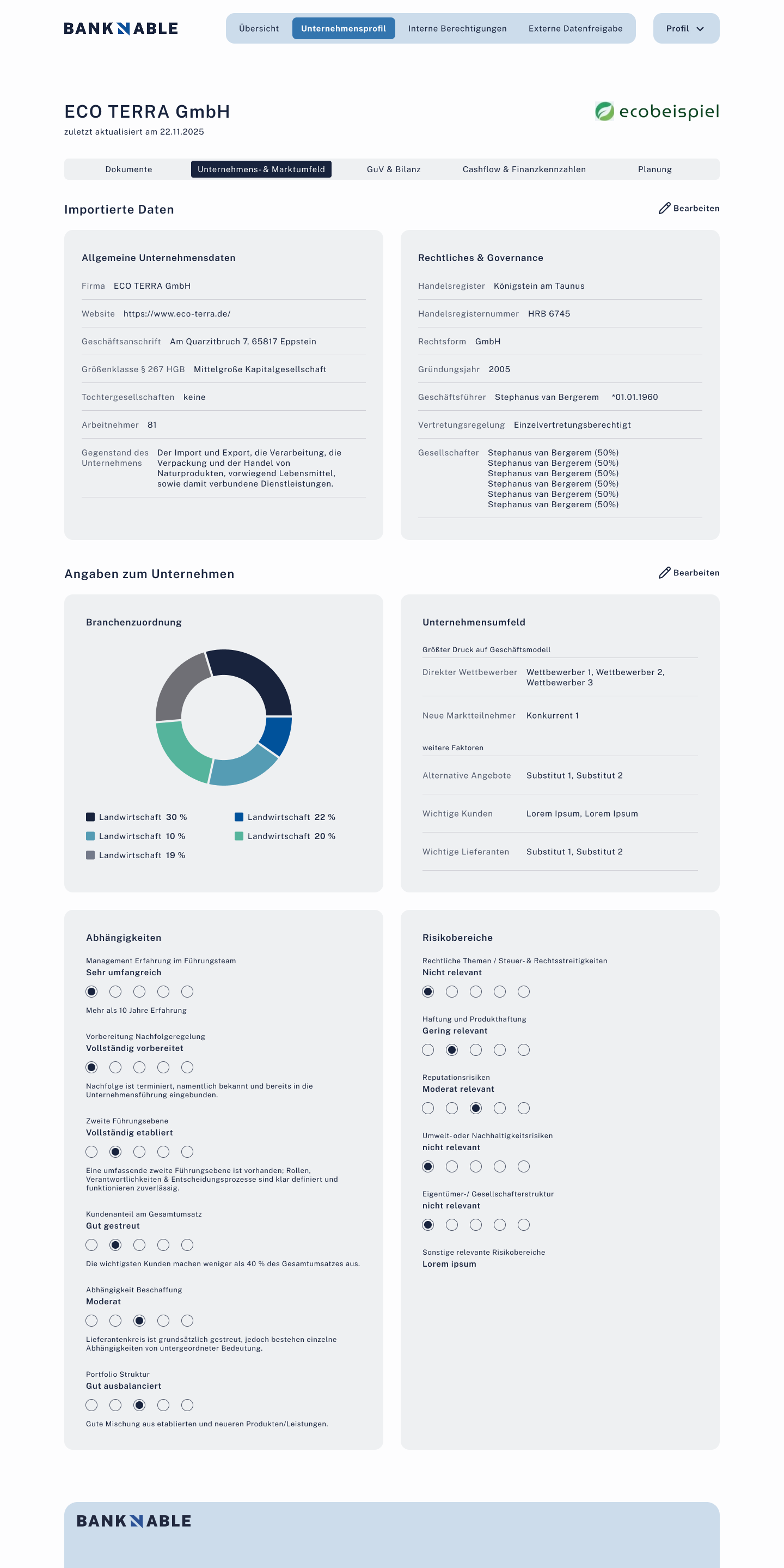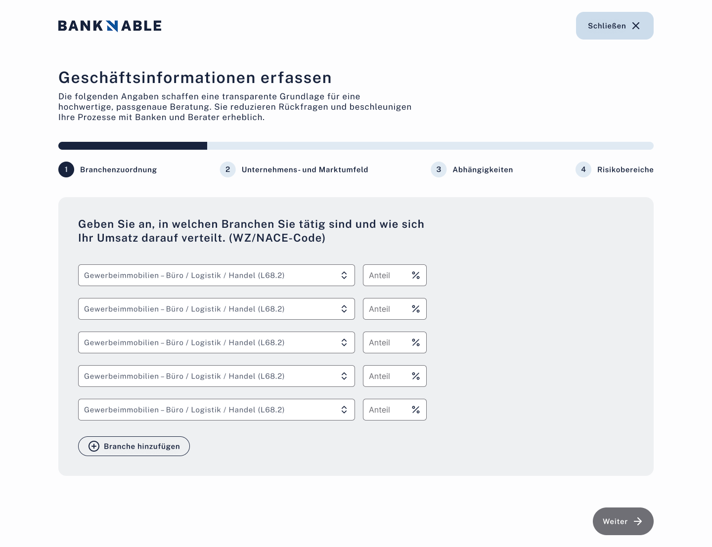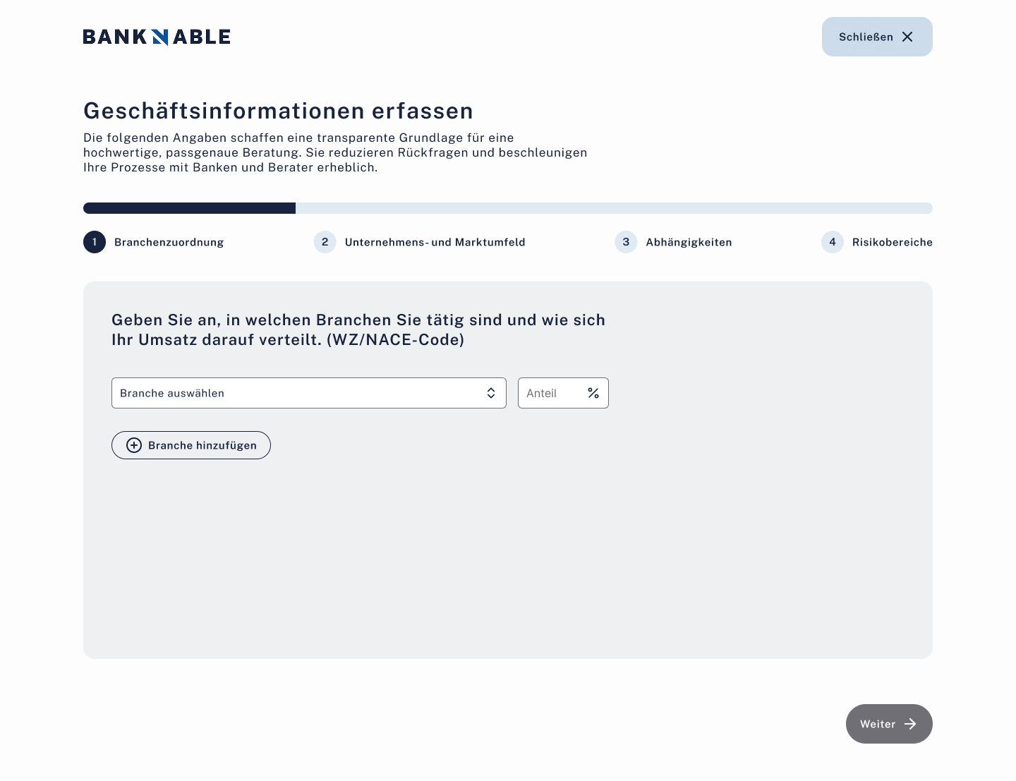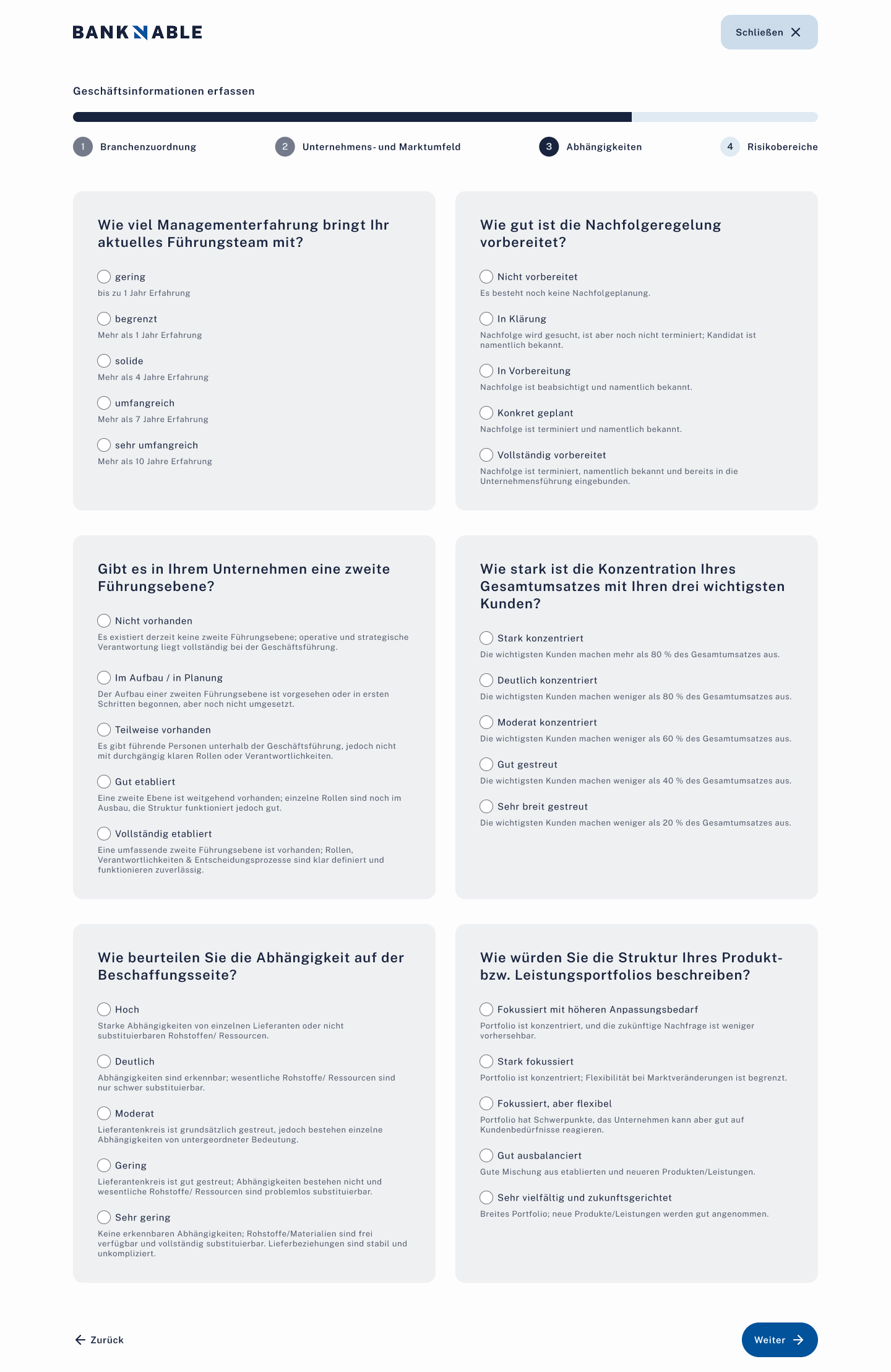 Offen4-Schritte-Wizard: Branchenzuordnung, Unternehmens- & Marktumfeld, Abhängigkeiten, Risikobereiche.