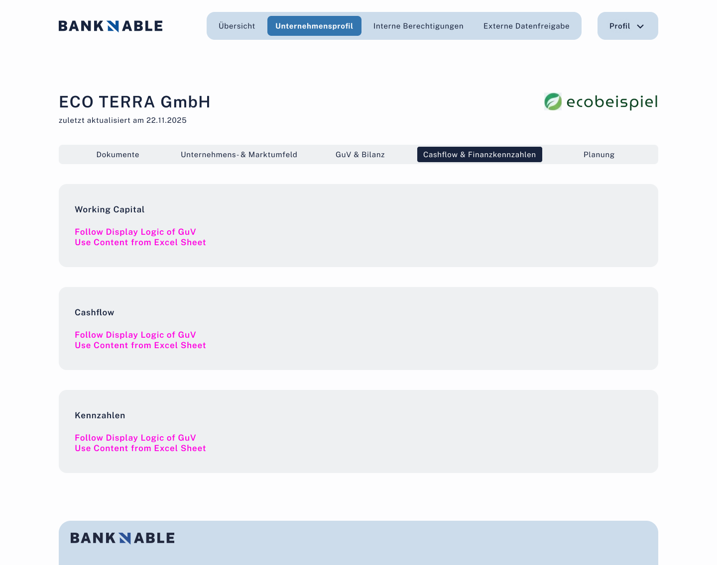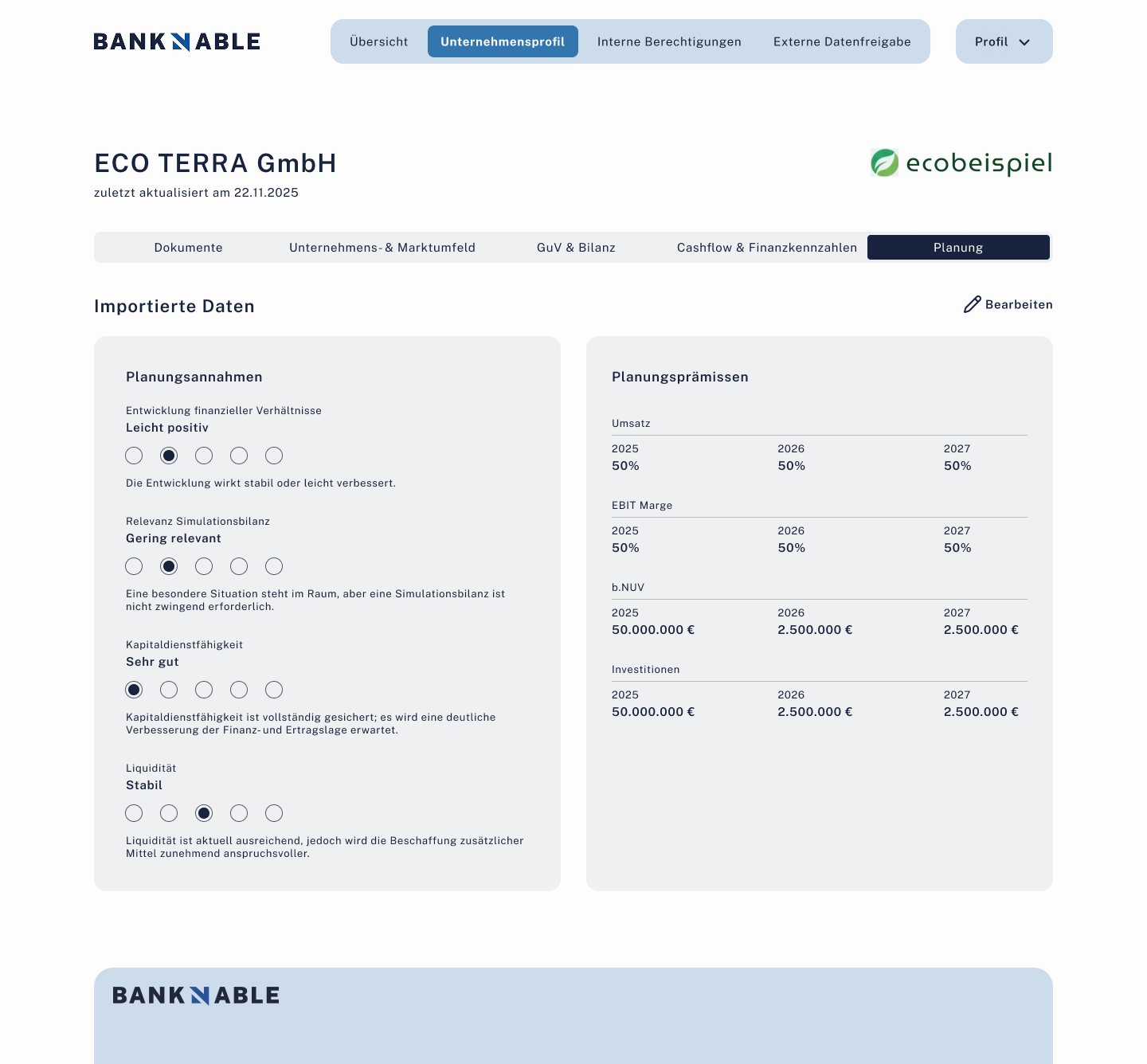 Offen5 Sub-Tabs: Dokumente, Unternehmens- & Marktumfeld, GuV & Bilanz, Cashflow & Finanzkennzahlen, Planung.