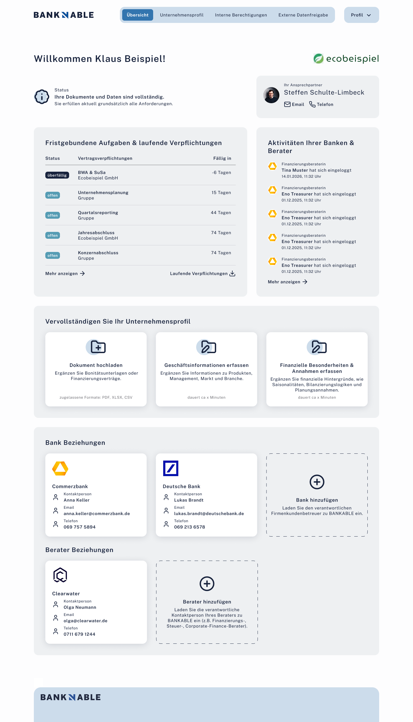 OffenStartseite nach Login: Status-Box, fristgebundene Aufgaben, Banken & Berater Karten, Aktivitäten-Feed.