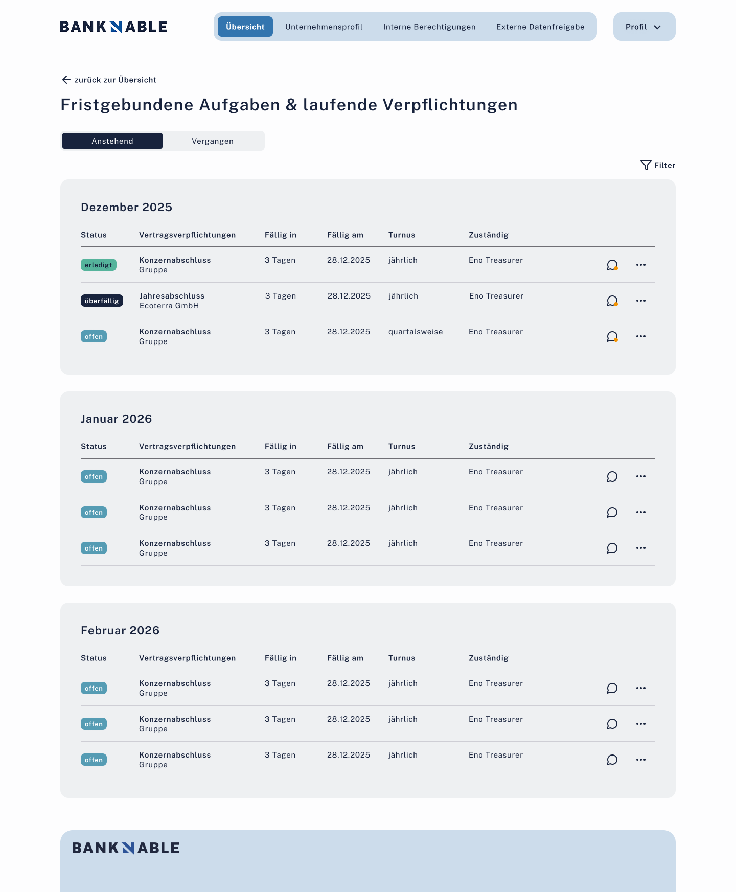 OffenFristgebundene Aufgaben aus Kreditverträgen. Tabs (Anstehend/Vergangen), Zuständigkeiten, Kommentare.