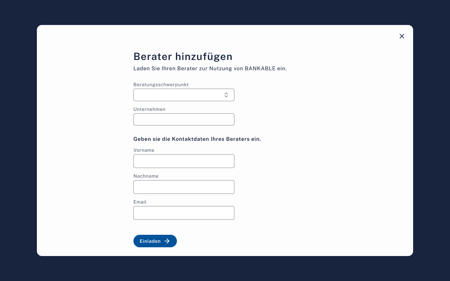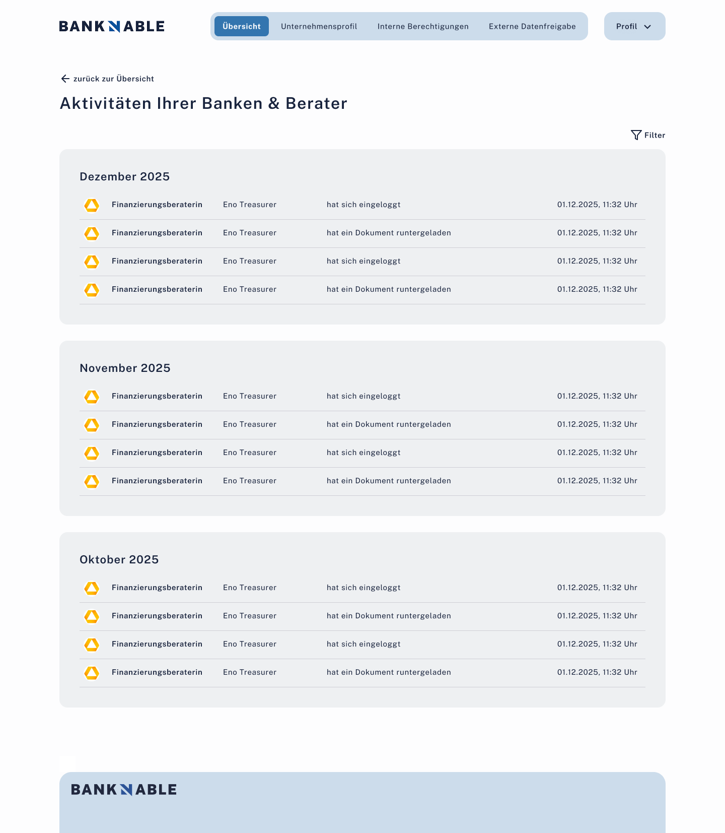 OffenBanken/Berater hinzufügen und einladen, Kontaktkarten, Detailseiten mit Aktivitätslog.