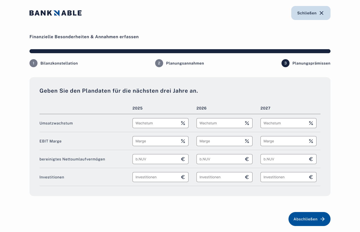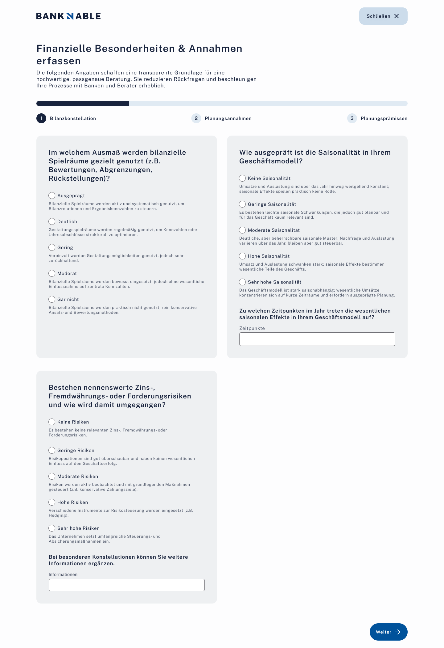 Offen3-Schritte-Wizard: Bilanzkonstellation, Planungsannahmen, Planungsprämissen mit Rating-Skalen.