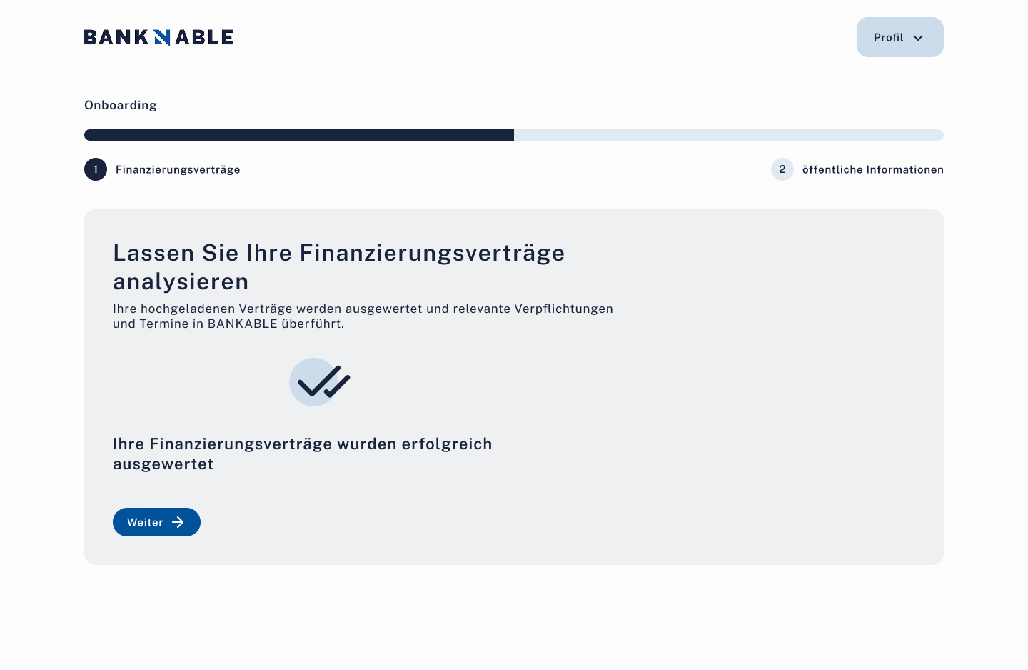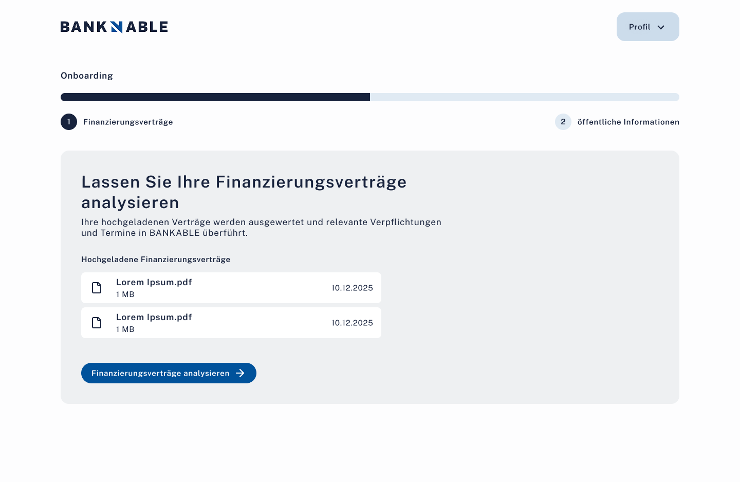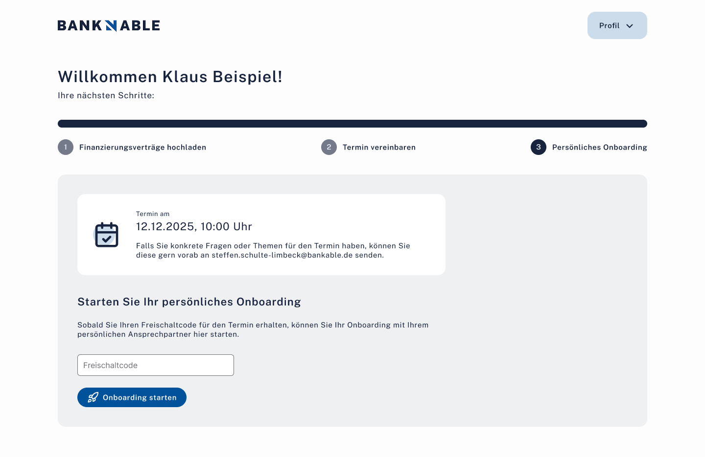 FertigEmail+Passwort Registrierung mit Email-Verifizierung. 3-Schritt Welcome-Flow (Verträge hochladen, Termin, Freischaltcode). 2-Schritt Analyse (Vertragsanalyse, öffentliche Daten).