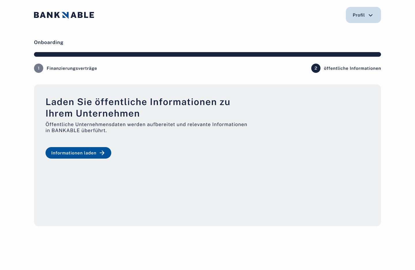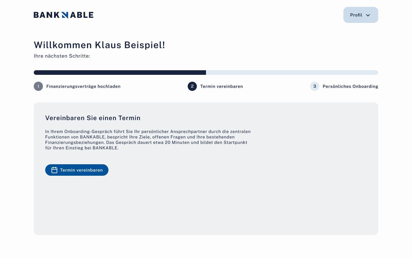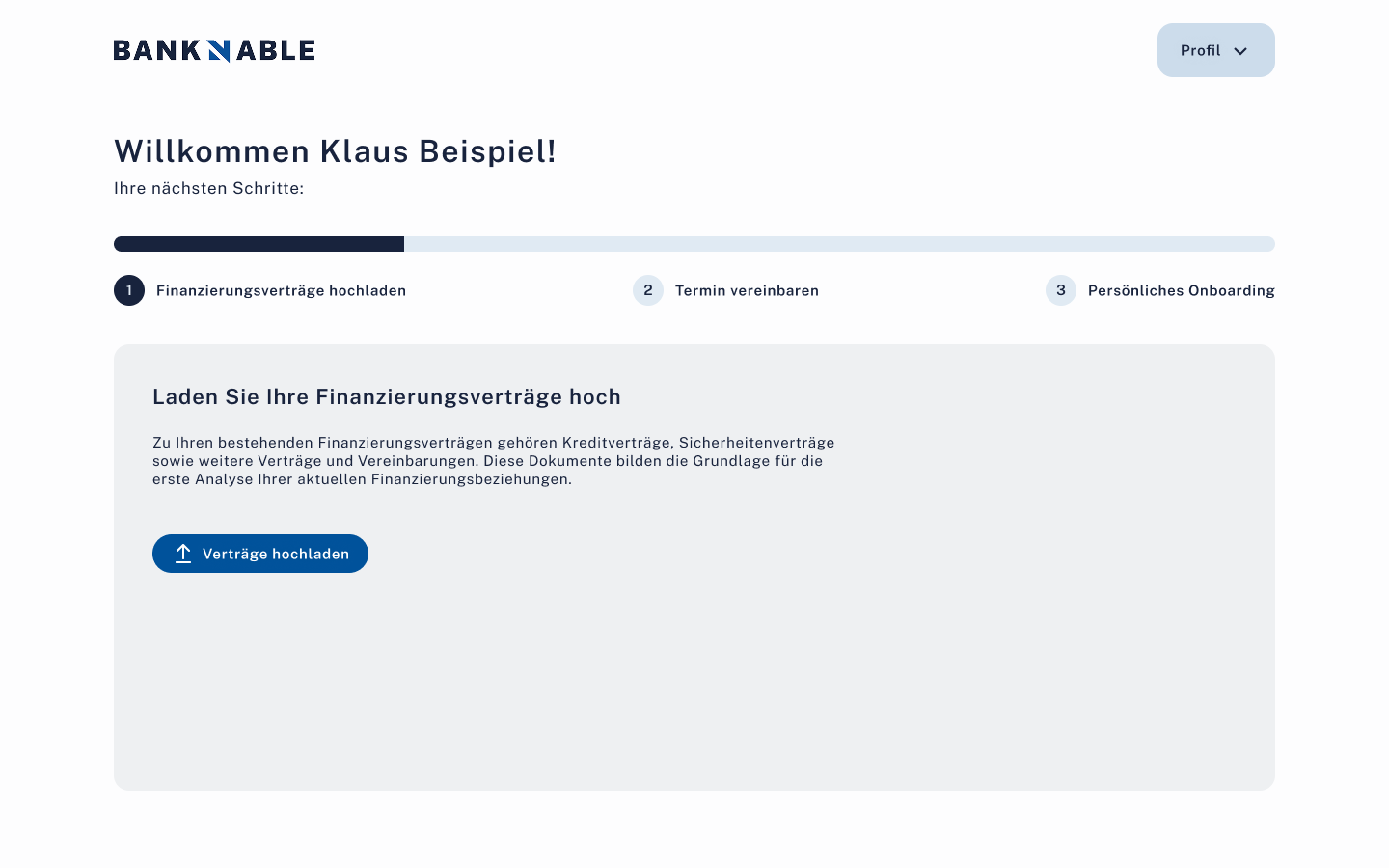 FertigEmail+Passwort Registrierung mit Email-Verifizierung. 3-Schritt Welcome-Flow (Verträge hochladen, Termin, Freischaltcode). 2-Schritt Analyse (Vertragsanalyse, öffentliche Daten).